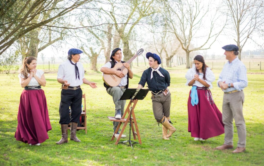 – y Día completo en Estancia El Ombú de Areco: recepción con empanadas y bebidas, cabalgata o carruaje, piscina en verano, almuerzo de parrilla argentina con bebidas, música folclórica en vivo con bailarines y demostración de doma de caballo.